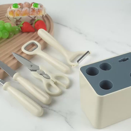 Product Name : Stainless Steel Kitchen Gadget Set ? Non-Slip Handles, Decorative Stand ? Scissors, Peeler, Paring Knife, Whisk, Bottle Opener ? Essential Kitchen Utensils Gift Set - 1 Set